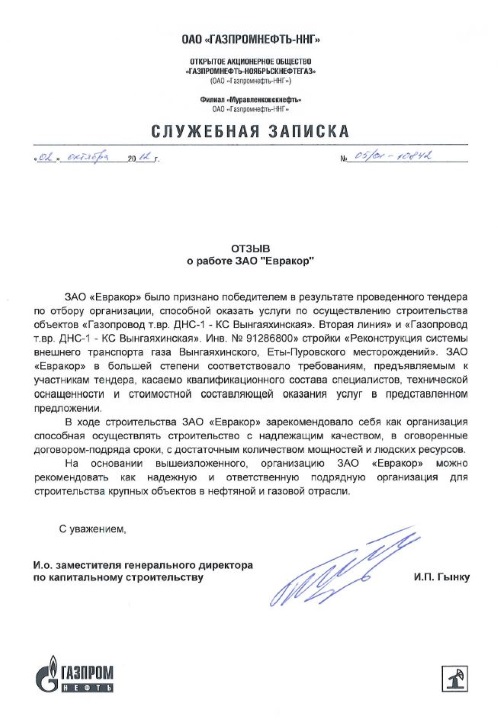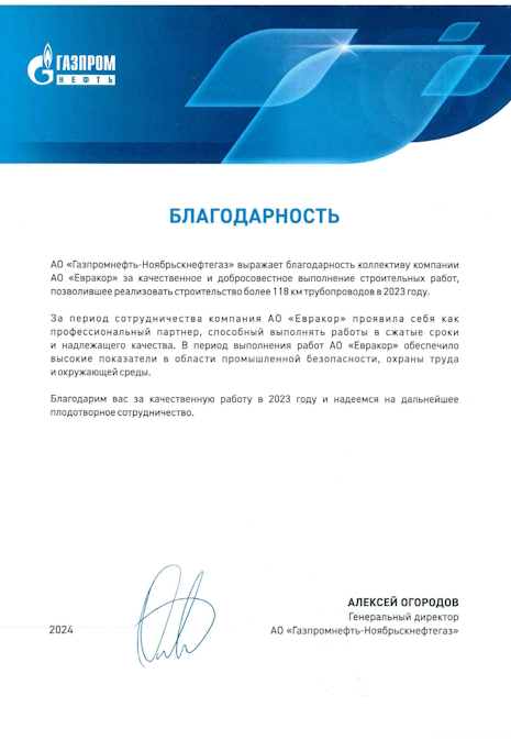 Благодарность от АО "Газпромнефть-Ноябрьскнефтегаз"